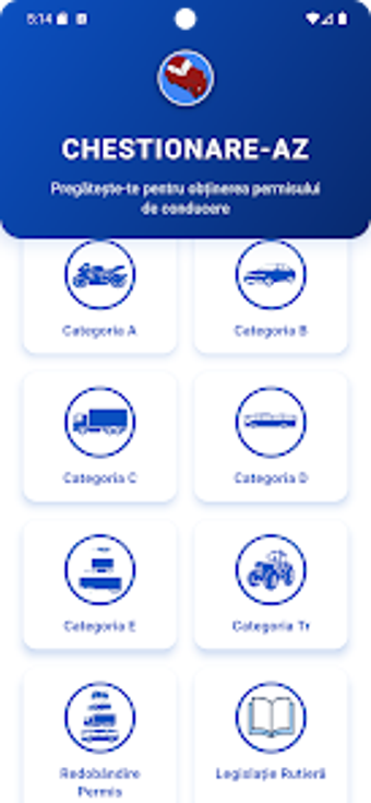 Chestionare-AZ Auto 2025 هو تطبيق تعليمي مصمم لمستخدمي Android الذين يستعدون لامتحان القيادة النظري في رومانيا. يقدم بيئة تعلم كاملة مع أسئلة DRPCIV الرسمية مصنفة حسب فئات المركبات A و B و C و D و E و TR، ولإعادة إصدار رخص القيادة. يمكن للمستخدمين الوصول إلى أسئلة محدثة مطابقة لتلك التي يواجهونها في اختبار القيادة الفعلي DRPCIV، إلى جانب شروحات مفصلة واستشهادات قانونية ذات صلة من تشريعات الطرق.